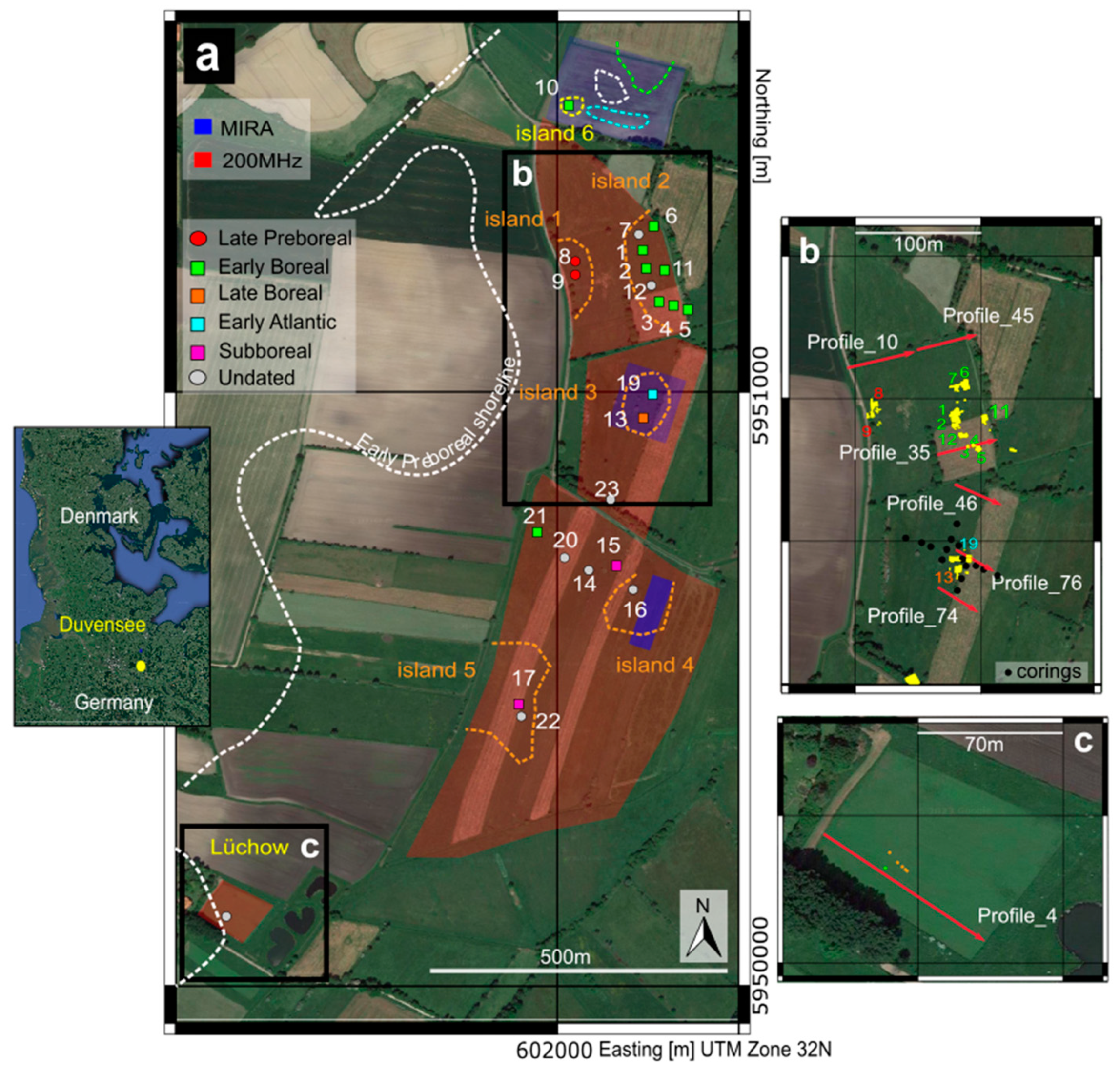 - Corradini, E.; Wilken, D.; Zanon, M.; Groß, D.; Lübke, H.; Panning, D.; Dörfler, W.; Rusch, K.; Mecking, R.; Erkul, E.; et al. Reconstructing the palaeoenvironment at the early Mesolithic site of Lake Duvensee: Ground-penetrating radar and geoarchaeology for 3D facies mapping. Holocene 2020, 30, 820–833. [Google Scholar] [CrossRef]