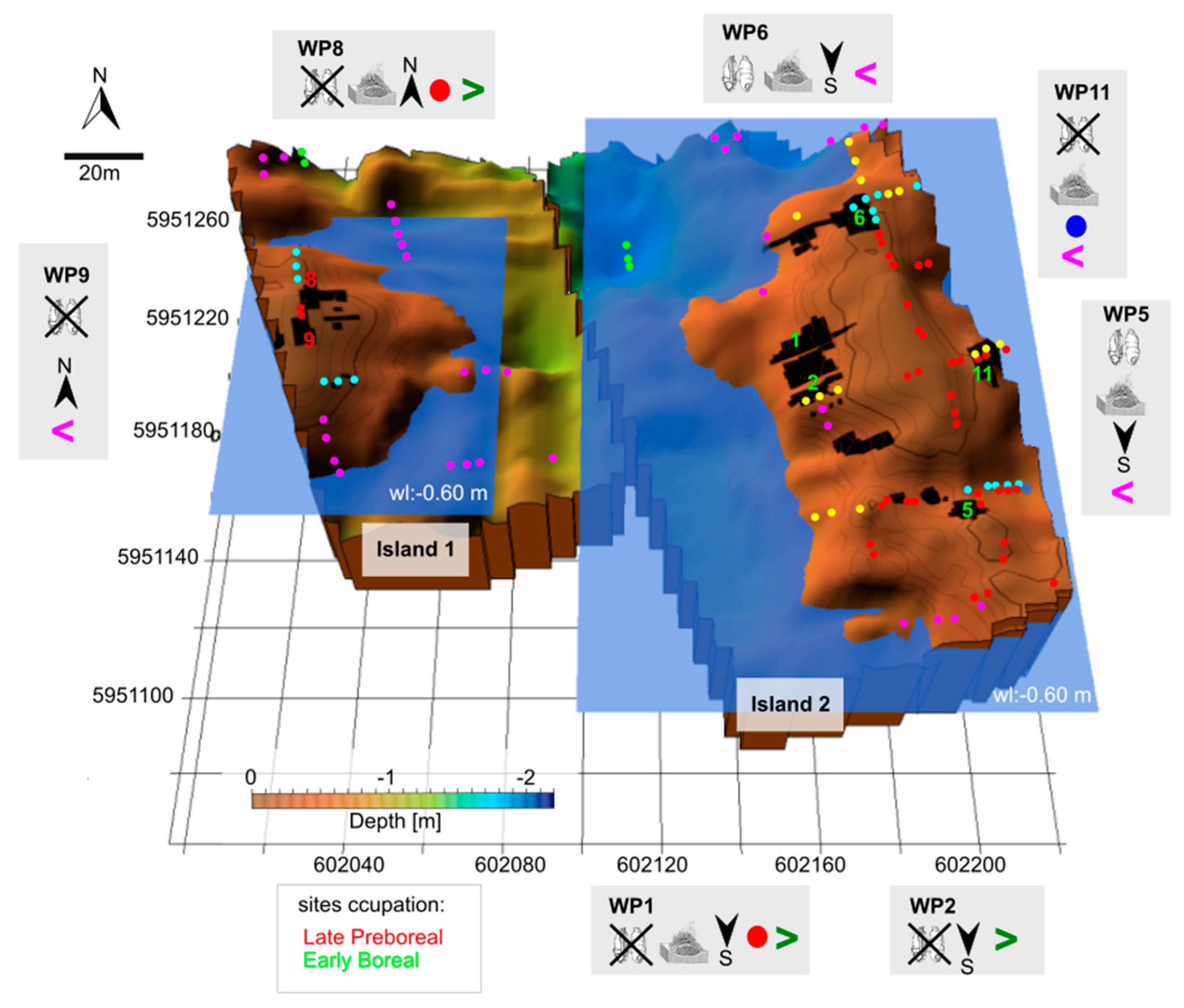 | WP7, WP12 (2) | undated | ? | ? | ? | ? | Not real sites. Indeterminate find accumulations (charcoal, burned wood) in the shore area |