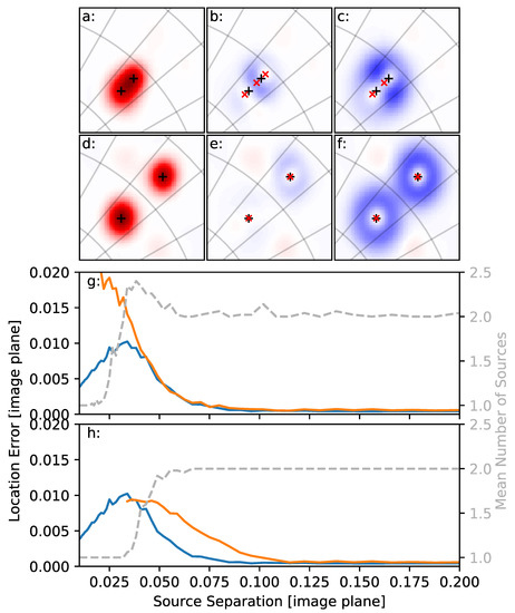 Depiction of the effects of deconvolution determined through simulation. (a) is a dirty image of two simulated sources separated by 0.042 on the image plane (3.4 at 45 elevation). The black + marks the true location of the simulated sources. (b) is the residual image after deconvolving with a Gaussian whose standard deviation . The red × show the locations determined by the deconvolution algorithm. (c) is the residual image after deconvolving the simulated dirty image with a Gaussian of standard deviation . The red × show the locations determined by the deconvolution algorithm. (d–f) are the same as (a–c), except that the simulated sources are separated by 0.14 on the image plane (11.4 at 45 elevation). Images use the same projection format as Figure 1a; division lines in panels (a–f) are 10. (g) shows simulated results of the location error using for the order 1 (blue) and order 2 (orange) solutions as the separation between the sources is varied. The grey dashed line shows the mean number of solutions found in each trial. (h) is the same as (g), but using .