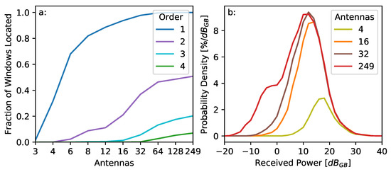 The probability density for the received power of a number of different antenna configurations is shown in Figure 5b. Here, the probability density is normalized against the number of integration periods imaged, rather than the number of point sources located. This means that the cumulative sum of each distribution will be less than unity if, on average, less than one source is located for each integration window (when a small number of antennas is used) and greater than unity if, on average, more than one point source is located per window (when a large number of antennas is used). Unsurprisingly, the number of low-power sources located increases rapidly as antennas are added to the array.