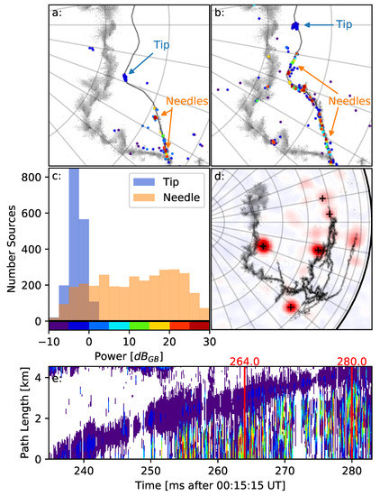 By examining the dirty images directly, it becomes clear that the positive leader tip is a continuously radiating feature. Figure 6e shows a streak image of the dirty image brightness along the positive leader channel line depicted in Figure 6a,b. The color shows the indicated received power of the dirty image using the scale in Figure 6c. Portions of the dirty image that have negative intensity are not physical and are masked in white. Both the positive leader tip and the needle activity are identifiable, with the positive leader tip being a continuous feature in front of the needle activity along the channel. Because of the finite angular resolution of the LWA, both the positive leader tip and the needle emission cause brightness along an extended length of the positive leader path in the streak image, obscuring the separation between them. Careful examination indicates that the positive leader tip is 1–2 km in front of the needle emission.