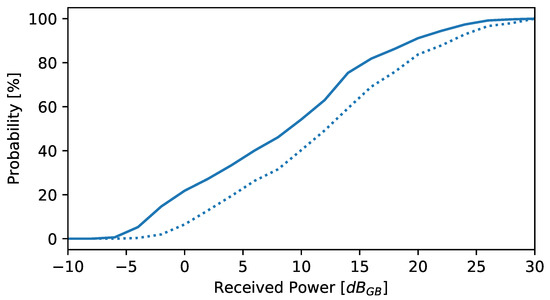 The relationship between the received power and source order. Solid line shows the probability that a source of a given power is the brightest source in the integration window (1 s). Dotted line shows the probability that a source of a given power is at least 3 dB brighter than any other sources in the same integration window.