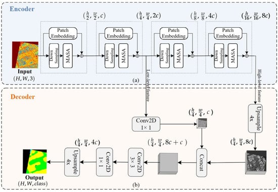The proposed framework, MASA-SegNet. (a) The encoder part of MASA-SegNet used for feature extraction. (b) The decoder part of MASA-SegNet used for pixel-level semantic classification. The parameter c represents the number of channels of features, and the value of parameter c in MASA-SegNet can be manually adjusted.