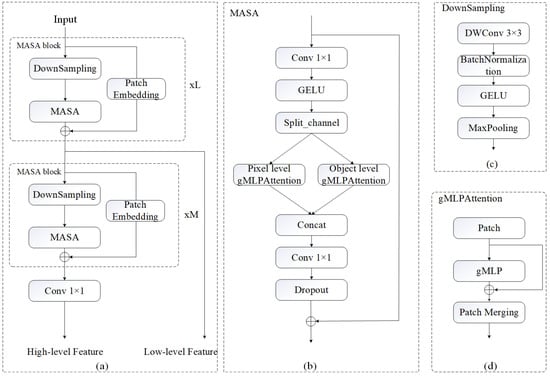 The encoding part of our network is a feature extractor composed of four layers of MASA blocks. As shown in Figure 3a, the preprocessed pseudocolor image, with a size of , is fed into the network. We stack two layers of MASA blocks sequentially to produce low-level features of in size, and c is set to 64. Each MASA block performs downsampling. The next two layers of MASA blocks are stacked to obtain high-level features, with a size of (). Our encoder pipeline is constructed in this way. It is worth noting that the number of MASA blocks used to extract high-level and low-level features can be variable.