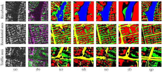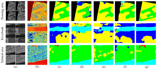 Visualization of experimental results on the AIR-PolSAR-Seg dataset. (a) Raw Multi-polarization SAR image; (b) preprocessed PolSAR data; (c) MASA-SegNet; (d) DeeplabV3+; (e) U-Net; (f) FUSAR-Map. (g) ground truth.