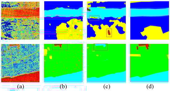 Prediction result images of ablation experiment on AIR-PolSAR-Seg dataset. (a) Preprocessed PolSAR data; (b) the result of MASA-SegNet; (c) the result of None-MASA; (d) ground truth.