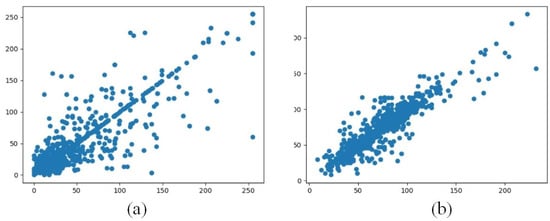 Traditional noise metrics such as Peak Signal-to-Noise Ratio (PSNR) and Structural Similarity Index (SSIM) require comparison with clear, noise-free data. However, the dataset lacks real noise-free images, which poses a challenge for evaluating denoising performance. The noise in SAR images appears as randomly scattered pixels due to its imaging mechanism. These pixels exhibit a random and discrete distribution within the image. Based on the noise characteristics of SAR images, we can assess image quality by comparing scatter plots before and after preprocessing. Scatter plots effectively display the distribution of pixel values in an image, with each point representing a pixel value, and the degree of scatter in the points of the scatter plot reflects the level of image chaos. We analyze the distribution of pixel point values qualitatively using scatter plots. Figure 9a contains a large number of randomly scattered points, representing random speckle noise, and in Figure 9b, the presence of outliers decreases, and pixel points are constrained within a certain range, demonstrating the effectiveness of our preprocessing method in denoising tasks.