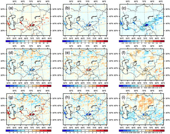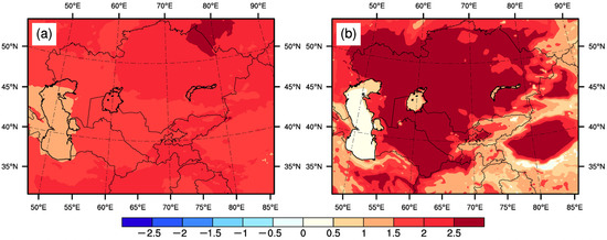 For Exp01, in croplands after irrigation, the latent heat flux increased (Figure 6a), and the sensible heat flux and the surface air temperature decreased (Figure 6b,c), which was completely consistent with the results of study [11]. Although the differences (Exp02 minus Exp01) in the irrigation-caused changes in the latent heat flux, sensible heat flux, and surface air temperature were not obvious (Figure 6d–f), the latent heat flux affected by warming did not increase (even decreased) in the main irrigation areas (such as the Fergana basin) (Figure 6d), which was also unreasonable. Here, the non-increases in the latent heat flux affected by warming corresponded to the non-increases in the irrigation amount (Figure 5b and Figure 6d).