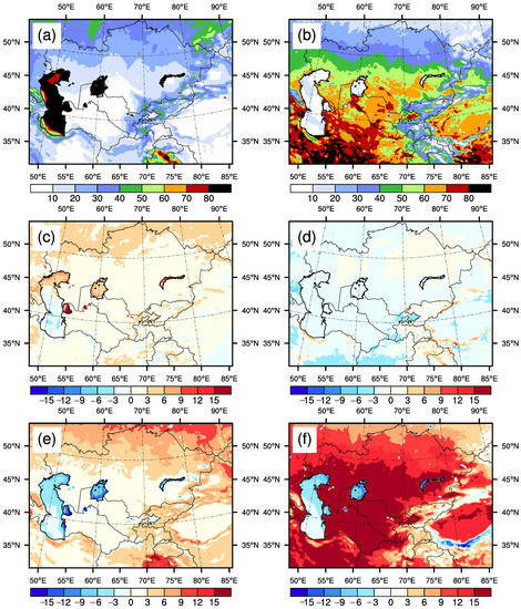 Figure 4a,b showed the spatial characteristics of the annual mean latent heat flux and sensible heat flux, respectively. It could be seen that, in addition to mountainous and water areas, and high-latitude regions, the surface energy was mainly allocated to sensible heat flux (Figure 4a,b). Although the surface air temperature of Central Asia was raised by 2.0 °C under the future high emission scenario, our simulations showed that the changes in latent heat flux and sensible heat flux were small (Figure 4c,d). Obviously, in the simulations of Exp02, the increased surface air temperature was only induced by the driving fields and had nothing to do with the changes in surface energy. In Exp02, for the non-irrigation period mean and the irrigation period mean values, the changes in latent heat flux and sensible heat flux caused by warming were also small, which was the reason that we only analyzed the annual mean values here.