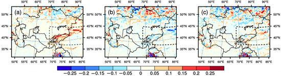 For Exp01, precipitation affected by irrigation obviously increased in the mountainous regions of the dotted box (Xinjiang province of China and Kyrgyzstan) (Figure 7a), which was completely consistent with a previous study [11]. As mentioned above, the precipitation affected by warming in the mid-latitude mountainous areas (dotted box) decreased during the irrigation period (Figure 3d), which led to that, in Exp02, the irrigation-caused increases in precipitation in the mountainous areas of the dotted box also decreased by 0.05–0.3 mm day−1, relative to Exp01 (Figure 7b).