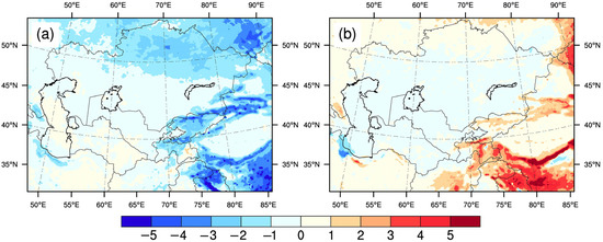 Figure 1 showed the simulated region. The land use type used was MODIS 20-category (Figure 1a). The model domain and the settings of the 3D grid points were consistent with a previous study [11]. The center of model domain was (44.5°N, 67°E), and the horizontal grid points were 196 (meridional) × 146 (zonal) with a horizontal resolution of 20 km. In the vertical coordinates, 33 eta levels from the surface to 50 mb were used. The lateral boundary adopted an exponential relaxation scheme and the buffer set 10 grid points. The driving fields of the WRF model were the bias-corrected CMIP6 global dataset, which were constructed by Xu et al. [41]. The reference data required for bias correction were the ERA5 reanalysis data. The model data were the outputs of 18 models from CMIP6. This dataset contained the historical period (1979–2014) and future scenarios (2015–2100) with 1.25° × 1.25° grid spacing and 6-hourly intervals, and the future emission scenarios of this dataset were SSP2-4.5 and SSP5-8.5.
