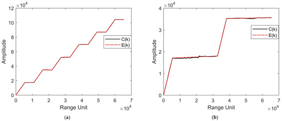 For a more intuitive representation, the abscissa of the target peak is marked in Figure 5c,d, respectively. It can be found from Figure 5c,d that the target peak is generated on the same range unit (65,537) through the matched filters and . From the above analysis, it can be concluded that the signal corresponding to the target peak coordinate is the echo signal of the real target. In Figure 5c, the false target peaks caused by , , and appear in the matched filter , but no peaks are found at the same coordinates in the matched filter ; in Figure 5d, the false target peak caused by appears in the matched filter , but no peaks are found at the same coordinates in the matched filter , which proves the effectiveness of the orthogonal signal proposed in Section 2. Then, by comparing the peak coordinates in Figure 5c,d, the interference signal can be directly recognized.