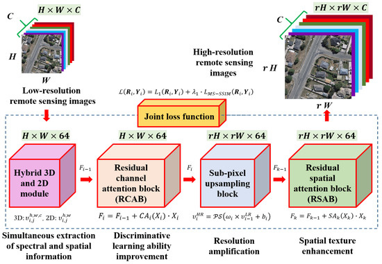 The flowchart of the proposed HSRN is illustrated in Figure 2. The LR remote sensing images are first input into the hybrid 3D–2D module to extract the abundant spatial–spectral information. Then, an RCAB is employed to learn and represent the acquired feature maps for improving the discriminative ability of the SR model. Moreover, the sub-pixel upsampling block is adopted to enhance the resolution of the incoming feature maps. Finally, the reconstructed feature maps are refined by our residual spatial attention block (RSAB) and turned into HR remote sensing images. The whole framework is constrained by a joint loss function and can be converged quickly.