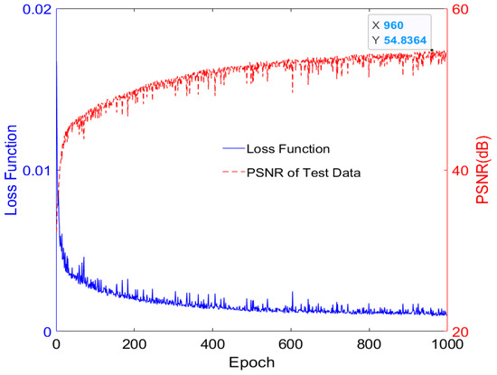 For the fairness of the experiment, all of the SR methods were trained on three remote sensing datasets separately and adopted the same hyperparameters to construct the SR models. We adopted the adaptive moment estimation (ADAM) to optimize the network, and the size of the label tensors was . We saved and selected the best model after running them for 1000 epochs. We set both the training and test batch sizes to 2, and the learning rate to . All the compared models were the original codes downloaded from the corresponding reference papers. A detailed running time will be presented in the following subsection. After setting these parameters, the PSNR of our HSRN increased, accompanied by a decreasing loss function, as shown in Figure 6. The stability and convergence of the loss function proves its behavior with good parametrics.