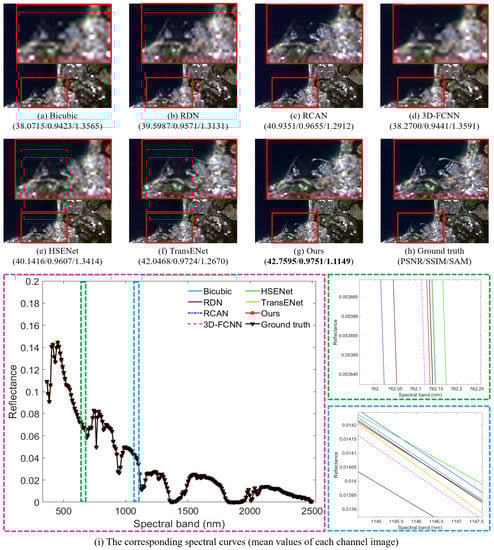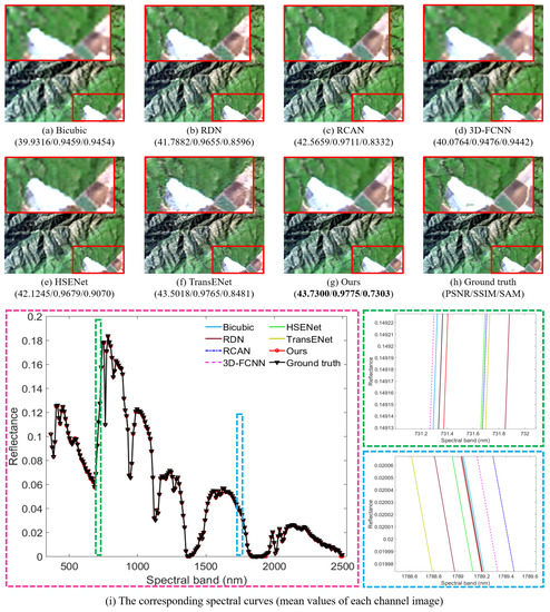To demonstrate the SR’s performance on different scenes, we tested the SR models on mountain areas, as shown in Figure 8. Figure 8a–g show the SR results (×4) of the Bicubic, RDN, RCAN, 3D-FCNN, HSENet, TransENet, and the proposed model, and Figure 8h,i are the ground truth and corresponding spectral curve. Again, our model outperformed the other SR algorithms, and alleviated the blurring artifacts. Our HSRN recovered more details in the mountain chain, as exhibited in Figure 8g. The reconstructed texture of our model highlighted in red rectangles was clearer than that of the state-of-the-art models. Meanwhile, the reconstructed spectral data of our SR model were more similar to those of the ground truth than those of the compared methods, indicating that our algorithm enhances the resolution of multi-channel images quite effectively at the expense of weak spectral distortion (Figure 8i).