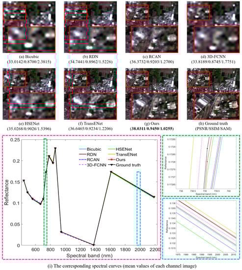 To prove the model’s scene adaptivity, Figure 10 exhibits the SR results of the urban area, which consist in detailed texture. Figure 10a–g are the SR results (×8) of the Bicubic, RDN, RCAN, 3D-FCNN, HSENet, TransENet, and the proposed model, respectively, and Figure 10h,i are the ground truth and corresponding spectral curve, respectively. The recovered HR images and spectral curves of our HSRN are more faithful to the ground truth. Nevertheless, all the compared approaches were affected by different degrees of blur (highlighted by red rectangles). Such obvious comparisons demonstrate that our model can extract sophisticated features and effectively improve the resolution of multi-channel images.