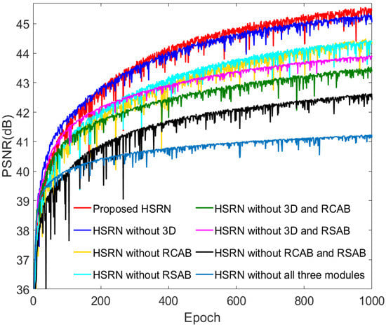 To verify the effectiveness of each component, we tested the SR’s performance by removing the individual block from the HSRN. The quantitative consequences are shown in Figure 13 and Table 8, showing that all the networks gradually converge. The basic SR model (without 3D, RCAB, and RSAB modules) obtained the worst reconstruction result, and the PSNR and SSIM were 41.2360 dB and 0.9715. The employment of the 3D, RCAB, and RSAB modules increased the PSNR by 3.39%, 6.52%, and 5.61%, respectively. This proves that all three modules are beneficial to the SR task, and that the RCAB is more effective than the others. The 3D module extracts the spectral-spatial information from the multi-channel remote sensing images and gains 1.3967 dB more than the basic SR models. The attention structure of the RCAB and RSAB strength’s spectral and spatial features achieved 2.6874 dB and 2.3116 dB more than the basic SR models. Moreover, the combination of these modules is more important than a single module for the RS model. The attention structure containing the RCAN and RSAB outperformed the other pairs. The best performance was achieved by our HSRN, proving the validity of the 3D, RCAB, and RSAB modules.