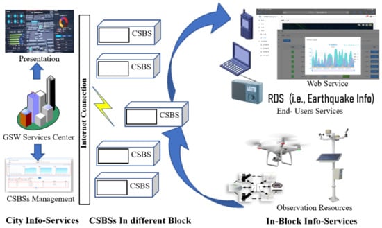 Positioning of CSBS in the city sensing system. The figure contains three parts. In-Block Info Services, CSBSs in Different Blocks, and City Info Services. With the support of CSBS, the observation information of sensing devices located in the same block can be processed directly by the CSBS. The CSBS also provides web service- and RDS-based text information service to the end-user in the block. There are different blocks in a city, and the CSBS in each block process the observation data effectively. The GSW service center subscribes to these data from CSBS, performs further processing and display, and GSW service center provides the management of CSBS.