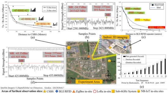 In the outdoor field test, three different sensing platforms, such as LoPAN (Zigbee™ and LoRa™), Sub-6GHz spread spectrum transmission, and NB-IoT, are included. To enhance the reliability of the experiment, three groups of in situ sites and RSA devices were made for the time calibration via the Beidou timing system before the field test. During the experiment, the RSA device is applied to capture the signal power when transmitting data from in situ sensors to the CSBS. As shown in Figure 5b,d, three sets of experiment results are averaged for a reliable signal power analysis.
