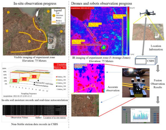 At present, our city pipeline system has been installed with wet underground environmental variables monitoring for a long time, and some of the pipelines are under high pressure year-round. Sudden water pipe damage or the infiltration and diffusion caused by minor ruptures often waste resources and cause economic loss. Even if sensors are deployed around the pipeline, the observation results cannot ensure high confidence. Building off the proposed CSBS, a collaborative sensing mechanism can be established by integrating all-in-one soil sensors that monitor temperature, humidity, conductivity, and pH in the subsurface, a high-precision thermal infrared camera, and an aerial camera with a multispectral/thermal infrared imaging system. This multiple-platform fusion experiment is illustrated below in two steps.