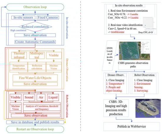 Model of collaborating heterogeneous sensing platforms in CSBS under traffic accident scenarios. In this figure, the left side shows the co-observation model with the in situ observation station, the UAV, and the robot; the flowchart on the right represents a schematic diagram of the co-observation procedure based on the co-observation model.