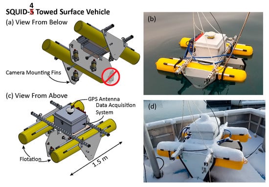 Engineering drawings and photography of the SQUID-5 system used for benthic photogrammetric mapping. During the operations at Lake Tahoe for this study, one of the five cameras did not function, as suggested by the notes on the diagrams, essentially making the system a four-camera system (or “SQUID-4”) for the survey. Panels (a,c) illustrate the relative layout of major system components of the towed surface vehicle. Panel (b) shows the towed surface vehicle as it floats on the water surface. Panel (d) shows the towed surface vehicle covered with snow while sitting on the support vessel before deployment.