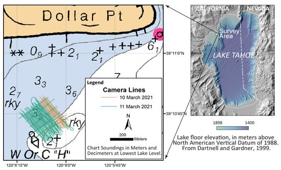 Owing to travel limitations imposed by the COVID-19 pandemic and the desire to use SQUID-5 in future coral reef mapping efforts, we attempted to find a location that closely resembled coral reef condtions. Based on experience gained mapping the Florida Keys, USA, in 2019 [], desirable study site characteristics included (i) sufficient water clarity, such that the bottom can be imaged from just below the surface using natural sunlight in depths as great as 8 meters; (ii) a navigable area of at least 200 m in length and width, with the majority of its water between 3 and 8 m of depth; (iii) stationary bottom features with adequate relief and texture to be reasonable proxies for corals and reef features; and (iv) accessibility for a support vessel that has weather-protected space large enough to accommodate two survey personel, a boat captain, acquisition computers, navigation equipment, digital displays, and deck space to launch and recover the SQUID-5 vehicle. The shallow, bedrock reefs of northern Lake Tahoe, USA (Figure 2), fit these requirements, because it is an ancient volcanic lahar formation that has been eroded into complex high-relief features. Additionally, a collaboration with the UC Davis Tahoe Environmental Research Center (TERC) and use of their 12-meter (40-foot) support vessel R/V John Le Conte ensured our ability to capture this area with tow speeds as low as 1.5 m/s.
