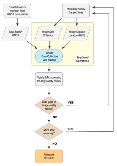 This survey operation benefited from several technological advances that allowed for the synchronous acquisition of imagery from multiple cameras and from a survey-grade GNSS system and the rapid storage and backup of the data captured. The operation also benefited from intensive planning to evaluate the best camera settings (Table 1), theoretical line spacing, and real-time survey navigation communications to the boat’s pilot. Additionally, the use and analysis of survey data while in the field allowed for near-real-time assessments of survey coverage and potential gaps. The inclusion of SfM basic image alignment data processing during non-survey hours, which are typically the nights between survey days, can allow for more thorough analyses of coverage while in the field (Figure 3). Although surveys could be conducted without some of these elements, they would likely be hindered by slower data collection speeds or longer survey operations to ensure complete coverage.