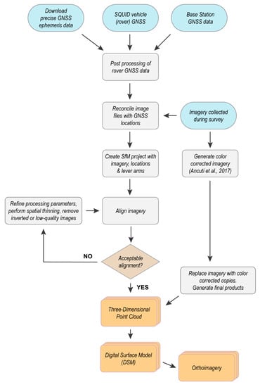 Data processing flow diagram for Structure from Motion (SfM) analyses and products of data obtained from the SQUID-5 system [].