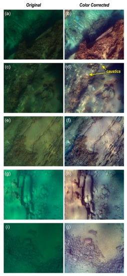 Examples of raw original imagery of the lakebed of the study area (a,c,e,g,i) and color-corrected versions of the imagery (b,d,f,h,j) using the techniques described in the text.