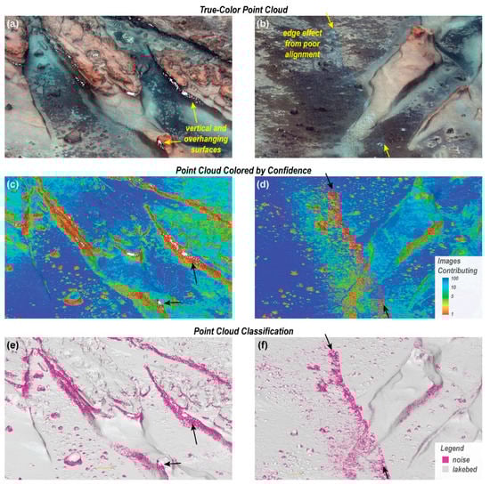Metashape was then used to generate a 3D point cloud using the high-resolution and moderate filtering settings [,]. This resulted in a total of 3.63 billion points for the 77,400 m2 study area, and each point included a RGB color value derived from the color-corrected photos and a confidence estimate, which was equivalent to the number of photos that were included to generate each point. Examples of the RGB colors and confidence values of small sections of the point clouds are shown in Figure 6. Low point confidence was found in two general areas: (i) near vertical and overhanging rock faces, where few images were able to resolve the feature (Figure 6, lefthand column), and (ii) areas where poor alignment made short (several meters in length) linear offsets at the outermost edge of image projections (Figure 6, righthand column). The occurrence of (i) was persistent through the study area, whereas less than a dozen examples of (ii) could be found. Both areas of low confidence were represented by noisy output in the point clouds that did not mimic lakebed morphology (Figure 6). Thus, we classified the point clouds based on confidence values, and defined “noise” points to be products of only one image and “lakebed” points to be products of two or more images (Figure 6e,f). This resulted in about 425 million, or ~11.7% of the points, classified as noise. The resulting lakebed point cloud had an average point cloud density of 4.1 points/cm2.