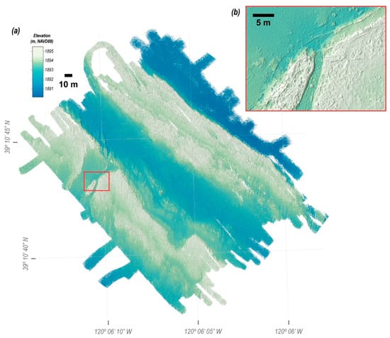 (a) The Digital Surface Model (DSM) for the complete study area derived during two days of surveying. The mean lake water level during the survey was 1898.44 m NAVD88. (b) Inset of a portion of the study area showing further details of the bathymetric characteristics.