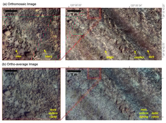 Example orthoimagery data from the study area from the two different techniques: (a) orthomosaic and (b) ortho-average. Differences in these products are highlighted with text and arrows. For a complete study area map of the orthoimagery products, see the USGS Scientific Investigations Map 3501 [].