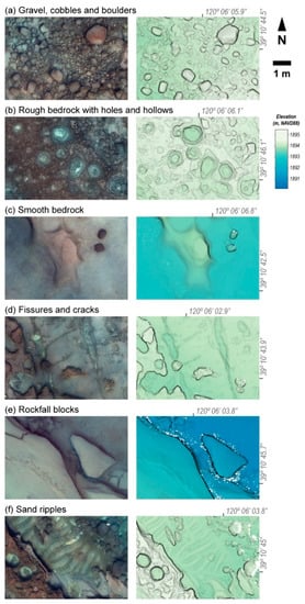 Combined, the DSM and ortho-average data provide detailed views of the geomorphic features of the study area (Figure 9). Lakebed characteristics include a diverse set of bedrock exposures, including hollows, smooth exposures, elevated platforms, fissures and cracks, and a broad distribution of sediment, ranging from sand to coarse sediment (gravel, cobbles, and boulders, Figure 9a). Additionally, the data provide evidence of geomorphic processes, including rockfalls along steep vertical faces (Figure 9e) and sediment transport from rippled bedforms (Figure 9f). The bathymetric data about these features are generally continuous, except adjacent to the steepest slopes and within complex areas—as shown with white pixels in Figure 9c–f—where the cameras could not acquire adequate imagery to resolve these features.