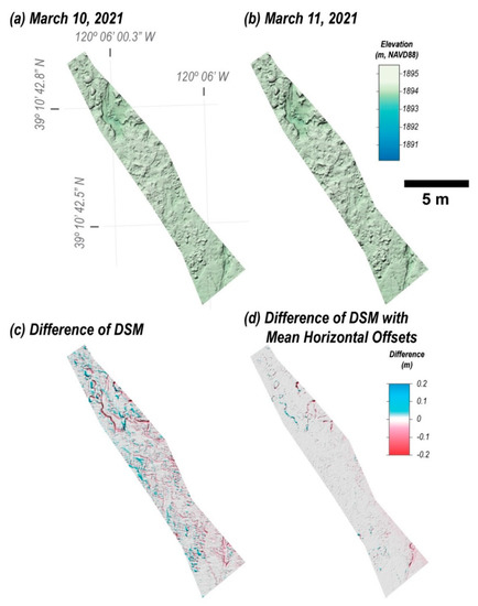 This horizontal offset in the two DSMs is confirmed with measurements of positional differences from eight markers placed on distinctive geographical features in each mapping area (Table 3). Consistent offsets were found for both eastings and northings, resulting in a total horizontal offset of 0.047 ± 0.001 m, and the difference in the elevation was found to be insignificant (0.001 ± 0.010 m; Table 3). If the mean horizontal offsets are applied to the DSM products, much of the vertical change is eliminated, and the variance in the differences between the DSMs is reduced from 0.018 to 0.007 m (Figure 10c,d). The vertical offsets remaining after this horizontal shift largely occur along steep slopes, which may be related to poor data quality along these difficult-to-photograph features, as noted in Section 3.1. In the end, the results suggest that position accuracy of independent SfM products without ground control were within 3–5 centimeters in the horizontal directions, and that the use of coincidental geographic points—without accurate survey position data—could be used to correct these offsets and produce sub-centimeter comparative DSM and orthoimage products (Figure 10d).