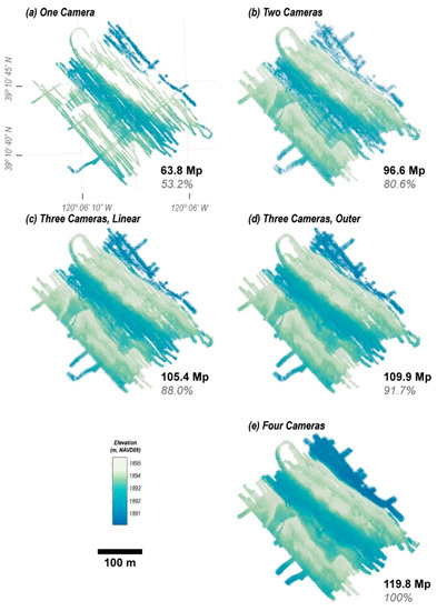 Mapping coverage substantially improved for two- and three-camera setups versus a single camera (Figure 11). These improvements can be attributed to a broader coverage, or “footprint,” of the lakebed from each pass of the SQUID-5 system as a result of the placement and orientation of multiple cameras. For example, two or three cameras resulted in approximately 80% to over 90% of the study area lakebed coverage that occurred for the four-camera collection (Figure 11b–d). However, although the total along-track width (or “swath”) for the imagery did not change for our two- and three-camera set-ups—all use the outside lateral cameras, which provide this broad swath—it is important to highlight that adding the third cameras significantly increased coverage and reduced the number and size of data gaps (Figure 11). Additionally, the data suggest that more coverage was obtained when the third camera was oriented outward (toward the forward direction) than straight downward. This is consistent with the outward-looking camera collecting somewhat more unique information within the complex lakebed landforms, in opposition of the more redundant information collected from the downward camera. That noted, our four-camera results, which included both the forward-directed and downward-directed cameras, provided even more coverage than either of the three-camera setups, and it also had a reduction in the number and size of data gaps (Figure 11). Interestingly, the added value of the third camera (~10 million more pixels) was roughly the same as the added value of the fourth camera (Figure 11).