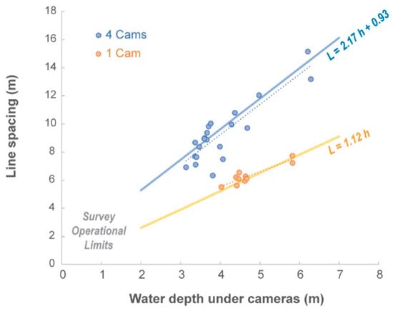 Comparison of the water depth and line spacing for locations where data gaps form in the Digital Surface Model (DSM) output for both a four-camera (blue symbols) and a one-camera analysis. The theoretical line spacings required for complete mapping assuming a flat bed, and the geometry and camera fields-of-views are shown with thick lines. The least-squared linear fits through the data are shown with dashed lines.