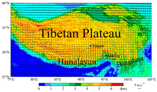 The topography of the Tibetan Plateau (TP) and the locations of Mêdog and Nagqu overlapped with 500 hPa wind averaged during summer season from 2014 to 2021 (plot at 0.5° grid resolution). The red rectangle denotes the Yarlung Zangbo Grand Canyon (YZGC).