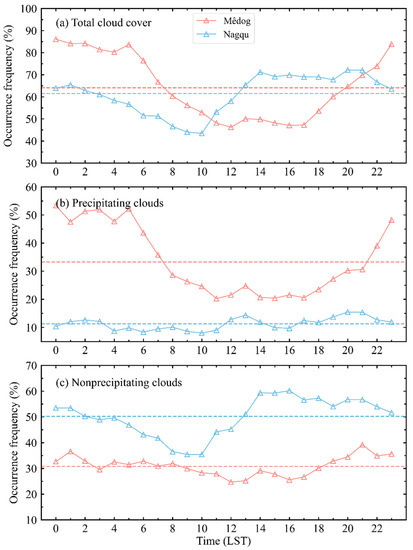 The diurnal variations of occurrence frequency of (a) total cloud cover, (b) precipitating clouds and (c) non-precipitating clouds in Mêdog (red triangles and lines) and Nagqu (blue triangles and lines) during summer season. The dashed lines represent the mean values.