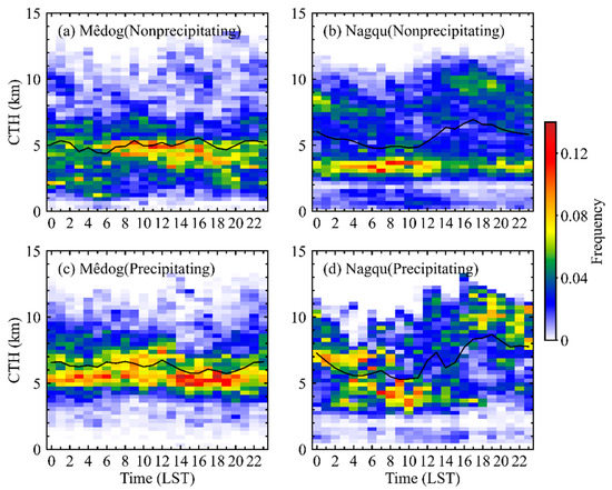 Diurnal cycles of occurrence frequency of CTHs in Mêdog (a,c) and Nagqu (b,d). The samples are vertically divided with a resolution of 300 m. The frequency for a pixel is defined as the ratio of samples within the pixel to the total number of samples for the corresponding 1 h interval. Mean CTHs are presented by the black lines.
