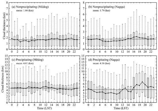 Boxplots of diurnal variations in cloud layer thicknesses in Mêdog (a,c) and Nagqu (b,d). The bottom and top edges of each box represent the 25th and 75th percentiles, respectively. The dots and lines represent the average.