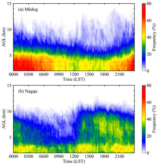In order to improve the understanding of the diurnal variation characteristics of clouds and precipitation in Mêdog and Nagqu, the occurrence frequencies of Ka-band cloud radar echoes were calculated every 60 s with a vertical resolution of 30 m (Figure 6). Only echoes with reflectivity higher than −40 dBZ were counted, considering the threshold was used to distinguish hydrometeor echoes from clear sky in this study. The frequency at each pixel in Figure 6 is defined as the ratio of the number of profiles with reflectivity >−40 dBZ to the total number of profiles. It can be seen from Figure 6 that the frequency distribution of radar echo in Mêdog and Nagqu had prominent diurnal variation during summer seasons. Radar echoes occurred more frequently at night than in daytime in Mêdog. The radar echoes were mainly distributed below 7 km AGL, above which radar echoes occasionally occurred (Figure 6a). This may indicate weak convective activity in Mêdog. The diurnal variation in frequency distribution of radar echo in Nagqu is obviously different from that in Mêdog. The frequency of high-level echo increased rapidly in the afternoon, and then declined slowly from the evening to the morning (Figure 6b). This is consistent with the diurnal variation in the cloud top over the center TP based on satellite data [56]. The rapid increase in high-level echo from afternoon to evening at Nagqu may be associated with the formation of convective activity due to strong surface heating.