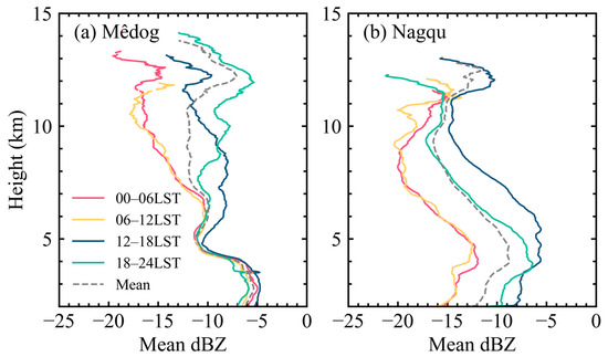 Vertical profiles of radar reflectivity in four periods of the day in (a) Mêdog and (b) Nagqu.