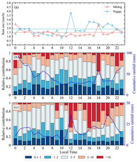 Diurnal variations in (a) rain rate obtained by disdrometers in Mêdog (red triangles and line) and Nagqu (blue triangles and line), and relative contributions of each rainfall rate category to the cumulative rainfall totals (mm) in Mêdog (b) and Nagqu (c). The blue lines in panels b and c represent the cumulative rainfall totals (mm) in Mêdog and Nagqu, respectively.