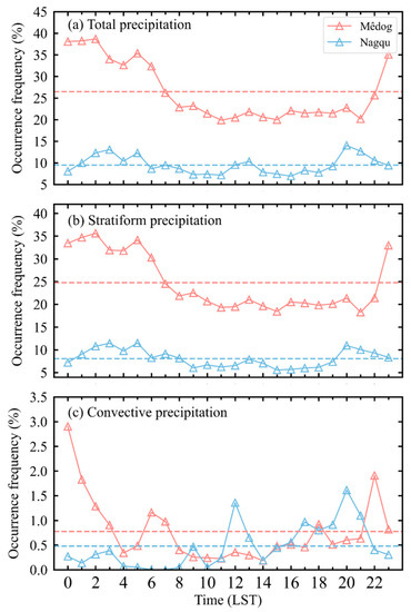 The diurnal variations of occurrence frequency of (a) total precipitation, (b) stratiform precipitation, and (c) convective precipitation in Mêdog (black triangles and lines) and Nagqu (blue triangles and lines) during summer season. The dashed lines represent the mean values.