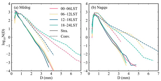 In addition to rain rate and occurrence frequency, the microphysical characteristics of precipitation also exhibit typical diurnal variation [7,33,46]. DSD plays an important role in reflecting the fundamental microphysics of rainfall [20]. Previous studies have demonstrated that different precipitation types generally have different DSD characteristics [20,27,57,58]. To investigate the diurnal variation characteristics of DSD in Mêdog and Nagqu, the 1 min DSD samples were divided at 6 h intervals (00:00–06:00, 06:00–12:00, 12:00–18:00, and 18:00–24:00 LST) and then classified as stratiform and convective precipitation. The samples of convective rain and stratiform rain during the four periods are listed in Table 3. In Mêdog, convective rain samples at night (00:00–06:00 LST and 18:00–24:00 LST) were higher than those in daytime. In addition, convective rain during 18:00–24:00 LST was characterized by the highest mean rain rate of 13.68 mm h−1. In Nagqu, the convective rain samples at 12:00–18:00 LST and 18:00–24:00 LST were significantly higher than those at 00:00–06:00 LST and 06:00–12:00 LST. The heavier convective rain occurred in the afternoon, with the highest mean rain rate of 14.0 mm h−1.