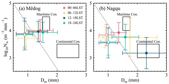 Variation of normalized intercept parameter, log10Nw (m−3 mm−1), with mass-weighted mean diameter, Dm (mm), in (a) Mêdog and (b) Nagqu. The samples are divided into 6 h intervals as in Figure 10. The solid rectangles correspond to the maritime and continental convective populations reported by Bringi et al. [58]. The dashed line indicates the separation line of stratiform and convective clusters according to Bringi et al. [58]. Below the dashed line to the left are the stratiform samples.