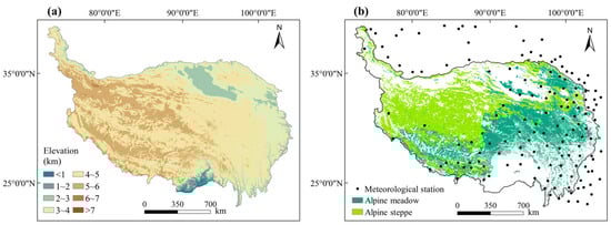 The TP is located in the southeastern part of China’s mainland, covering an area of about 2.5 million km2, which accounts for approximately 26.80% of China’s total land area []. As the world’s highest plateau, it boasts an average altitude exceeding 4000 m, gradually decreasing in terrain from southeast to northwest (Figure 1a). The TP features a typical plateau mountain and subtropical monsoon climate, characterized by diverse thermal and moisture gradients from southeast to northwest due to the influence of monsoon winds from the Indian Ocean and high elevation. Annual temperatures on the plateau range from −15 to 10 °C, while precipitation distribution varies significantly. The northwest regions receive less than 50 mm of annual precipitation, whereas the southeast regions receive over 1000 mm. The distribution of vegetation on the plateau is influenced by the spatial pattern of climate types, with the primary vegetation types consisting of alpine steppes, alpine meadows, and forests. Alpine steppes and alpine meadows together account for approximately 55.30% of the total area (Figure 1b).