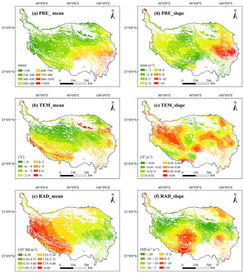 Spatial patterns of multi-year mean values (a–c) and the linear slopes (d–f) of climate variables (annual total precipitation (PRE), annual average temperature (TEM), and annual mean total radiation (RAD)).