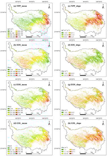 Spatial patterns of multi-year mean values (a–d) and the linear slopes (e–h) of net primary productivity (NPP) and phenological variables (the start of the growing season (SOS), the end of the growing season (EOS), and the growing season length (GSL)).
